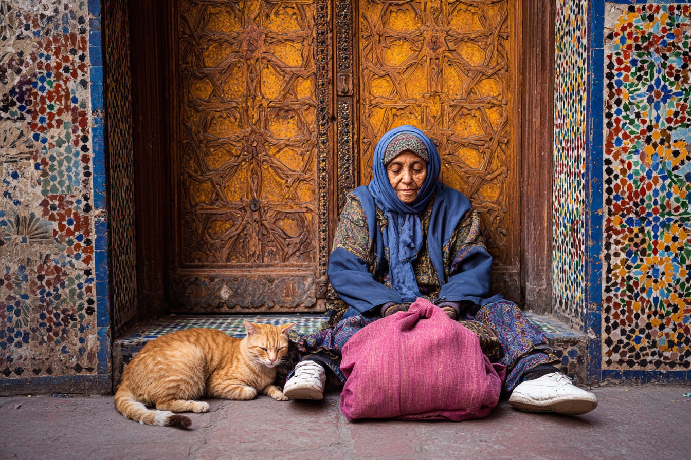 Cover prompt: A photograph of an elderly woman sitting on the ground with her cat, both sleeping in front of traditional Moroccan doors covered by colorful Islamic tiles and patterns. The woman is wearing white shoes and a blue scarf covering her head, with a pink fabric bag at her feet. The scene is filled with vibrant colors and warm sunlight, creating a peaceful atmosphere. The photograph was taken using a Sony A7R IV camera with a wide-angle lens, in a candid photography style and natural light. --ar 128:85 --sref https://s.mj.run/hPi24M63lJ0 --sv 4