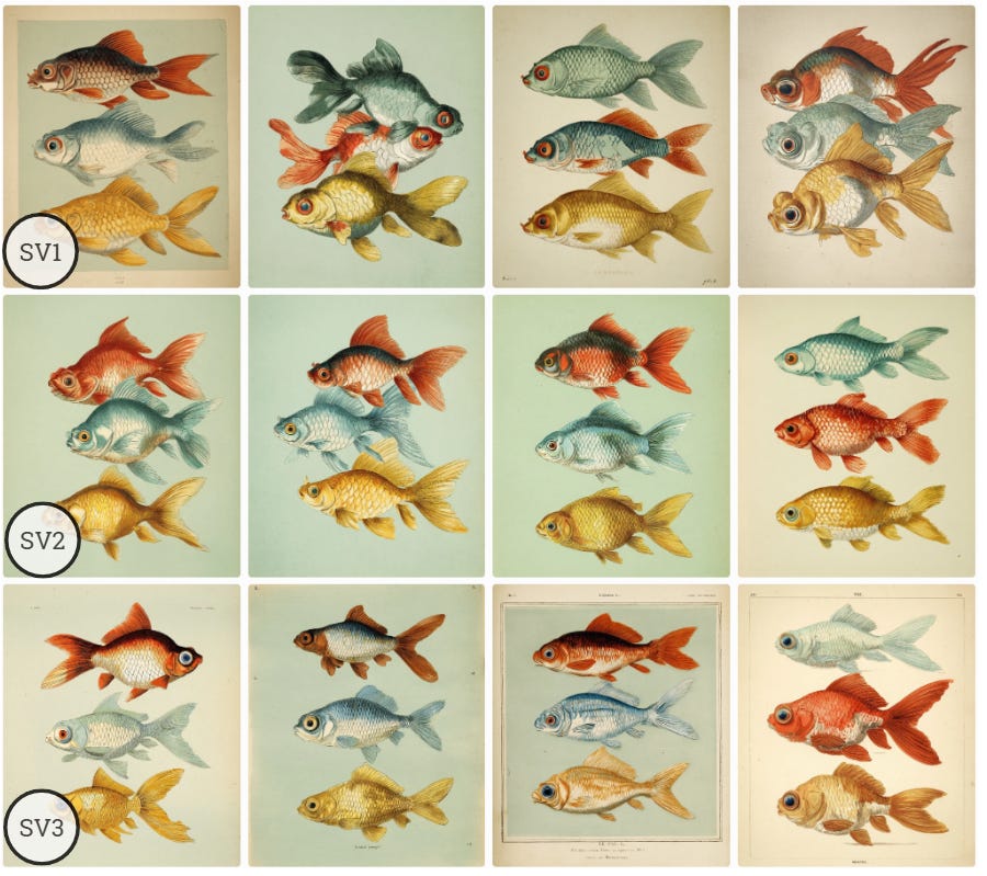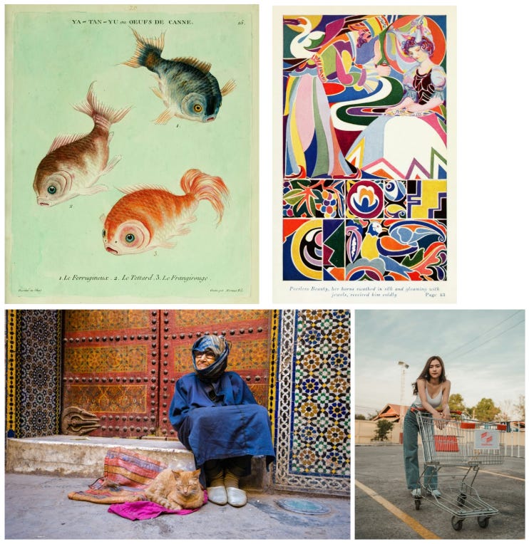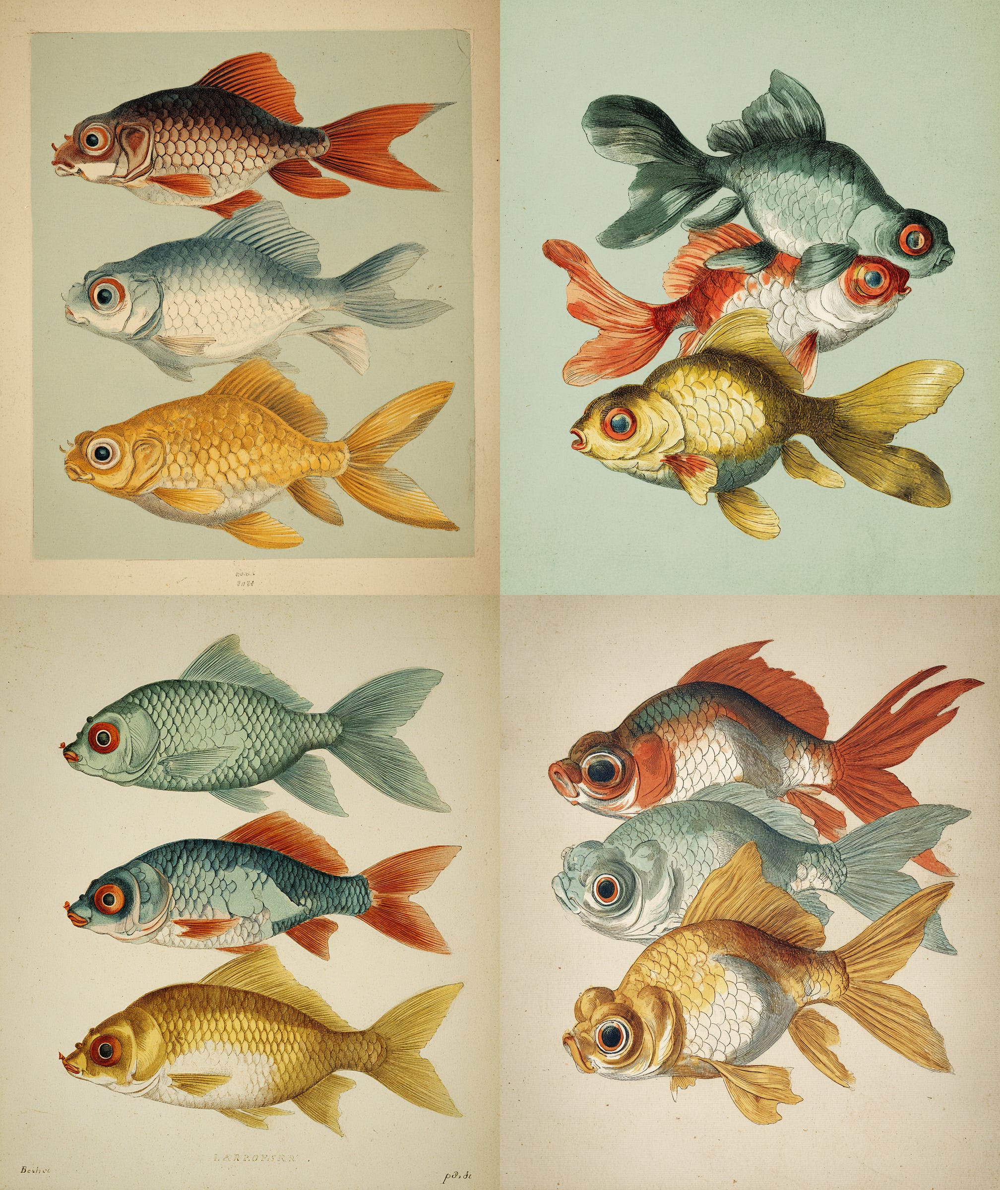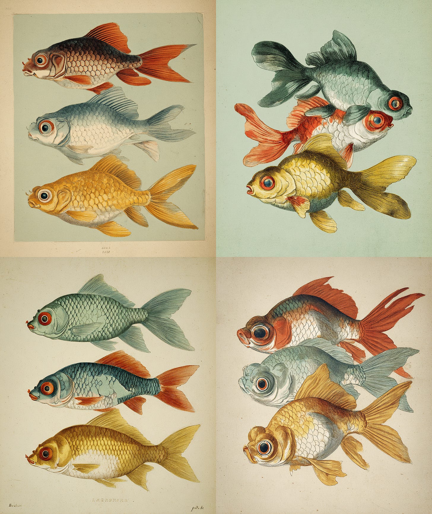 I picked four very different reference images: two illustrations from public archives and two photographs from Unsplash. Using external images was crucial because I didn't want any weird interference from Midjourney recognizing its own generated content.