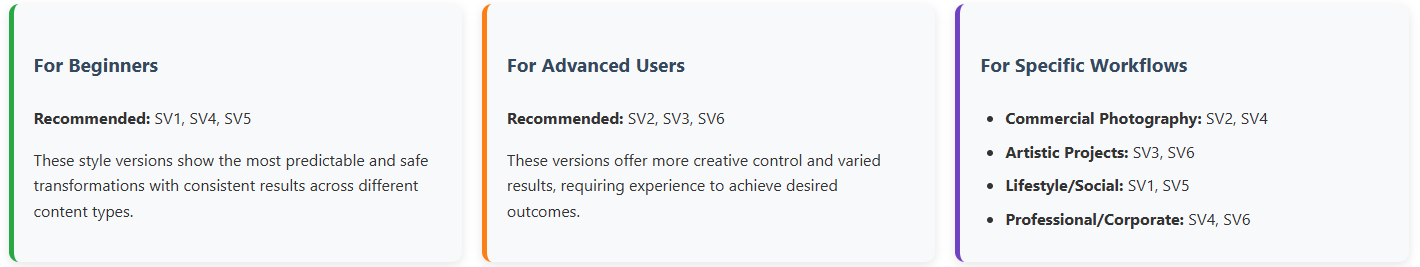 This difference matters for workflow planning. If you want dramatic changes from a photographic reference, you'll need to push harder with versions like SV2. But if you're working with illustrated references and want to maintain the original character, stick with conservative options like SV1 or SV4.