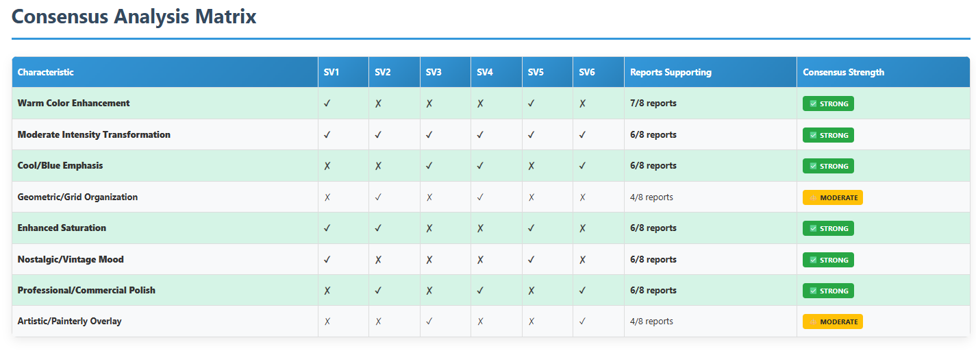 According to Claude: “Despite analyzing different base images, the style references show remarkably consistent behavioral patterns, with 75% of characteristics achieving strong consensus across reports. This suggests highly reliable and predictable style reference functionality that users can depend on for consistent results across diverse content types.”
