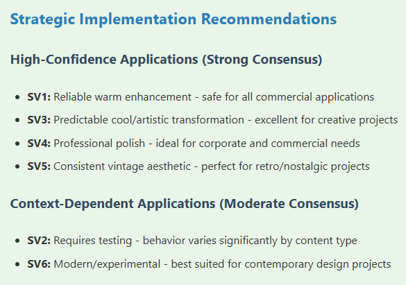 For professional projects, make SV4 your default choice. Keep SV1 as backup for conservative enhancement and SV5 for specific vintage needs.