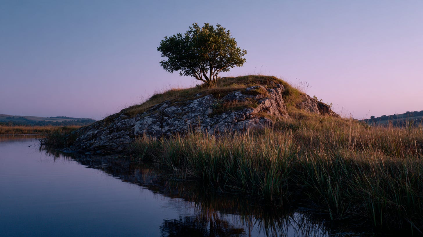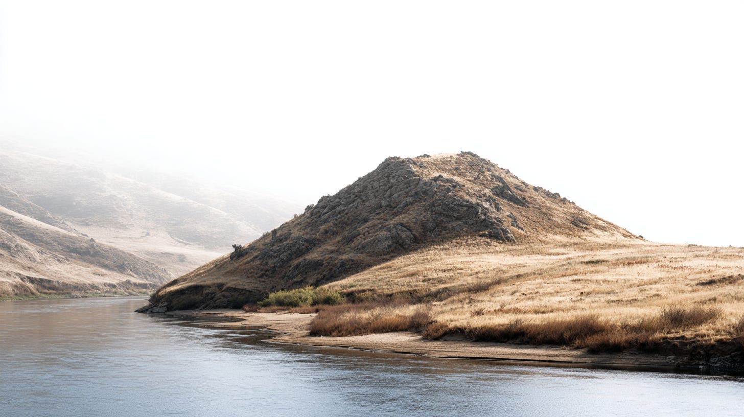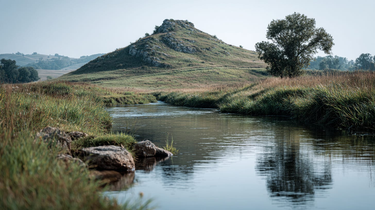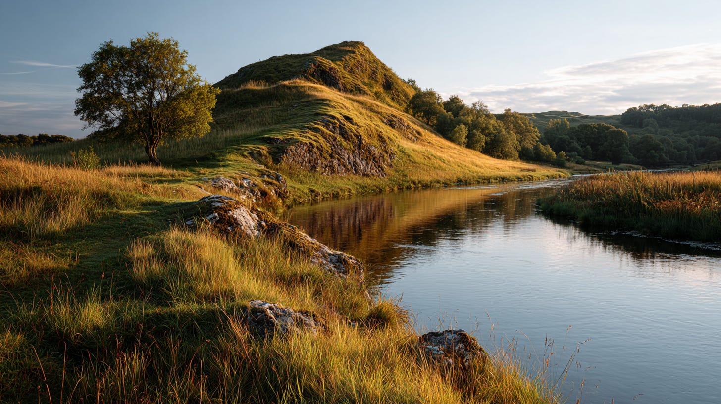 landscape photograph of a small hill near a river, {light spill, catchlight, continuous light, low key light, high key light, penumbra, form shadows, twilight, golden hour, reflected light} --ar 16:9 --v 7
