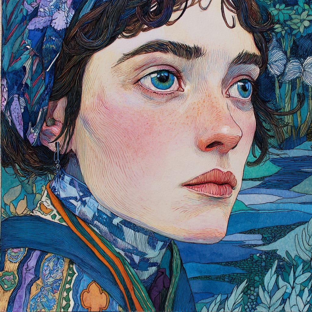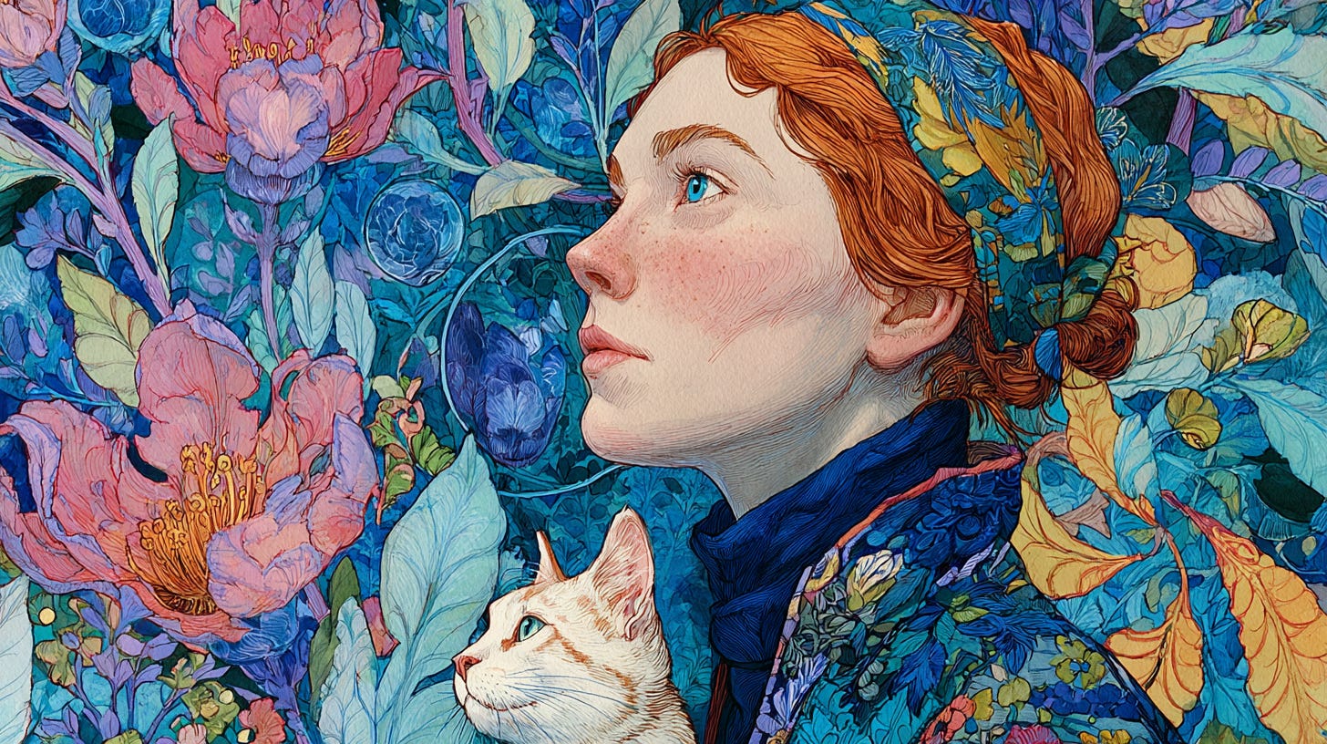 Cover prompt: Elegant art nouveau illustration featuring a graceful lady with a cat, surrounded by swirling floral vines and soft botanical motifs --ar 16:9 --sref 3595044843 --profile r3snb8i --sv 4 --v 7