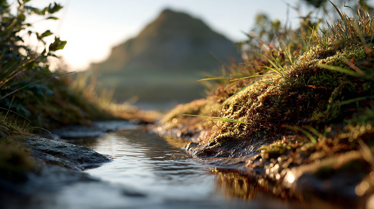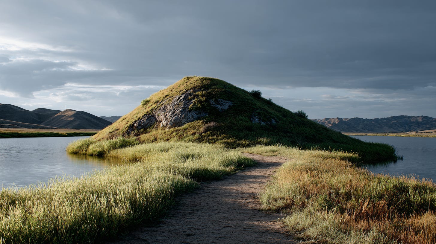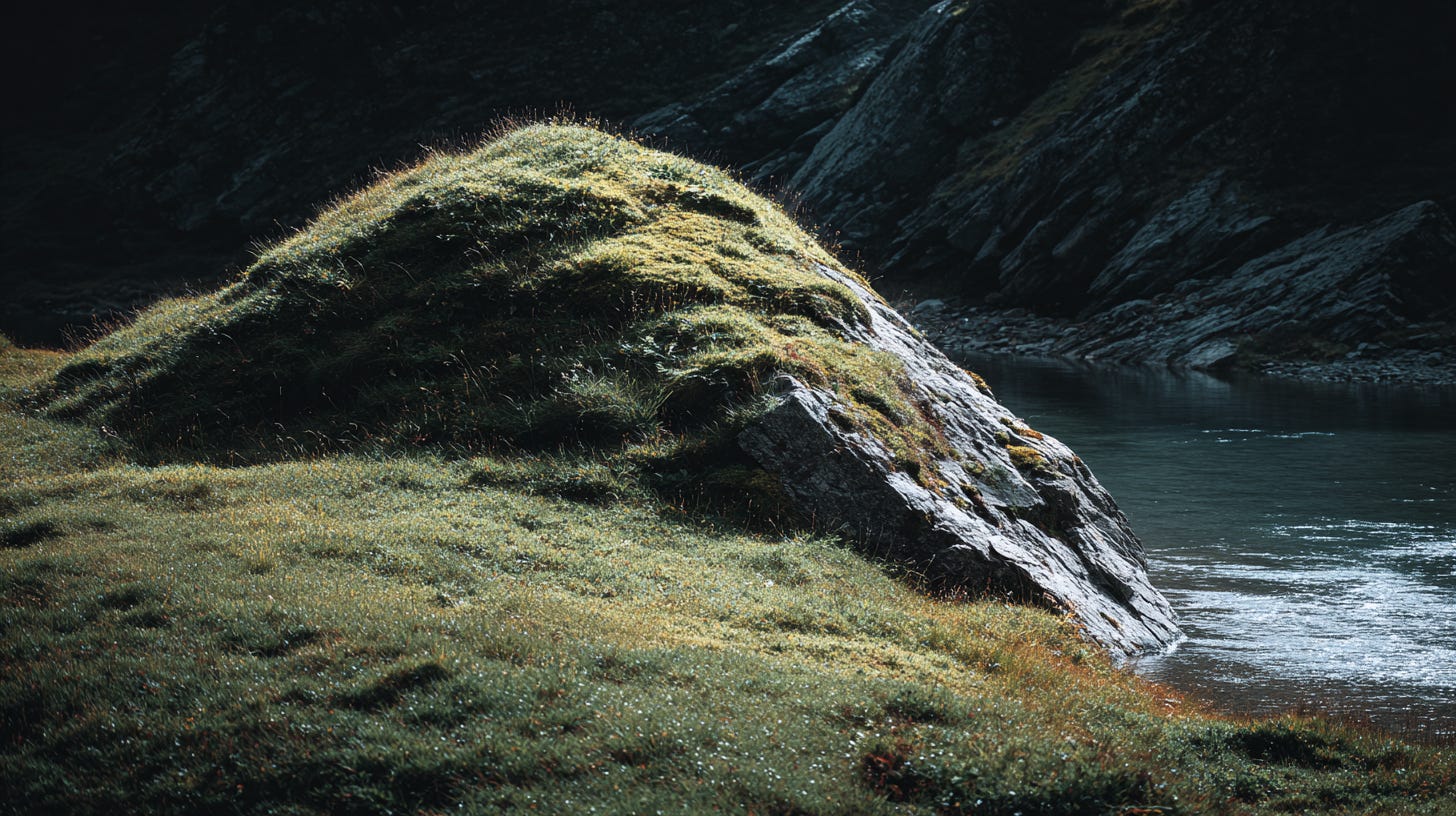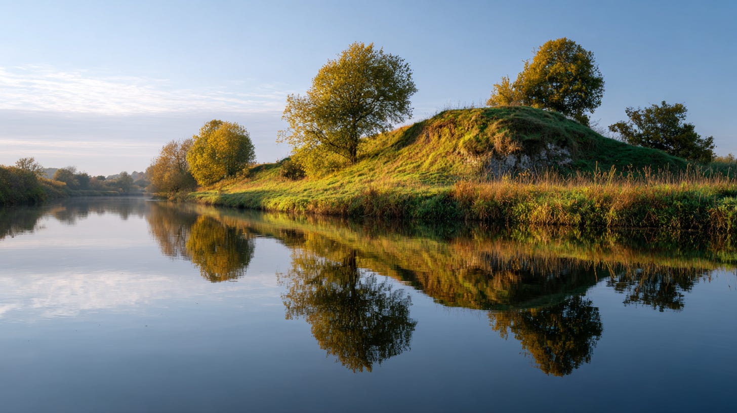 landscape photograph of a small hill near a river, reflected light --ar 16:9 --profile r3snb8i --v 7