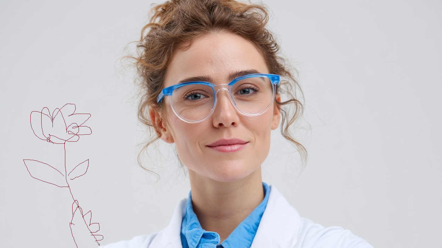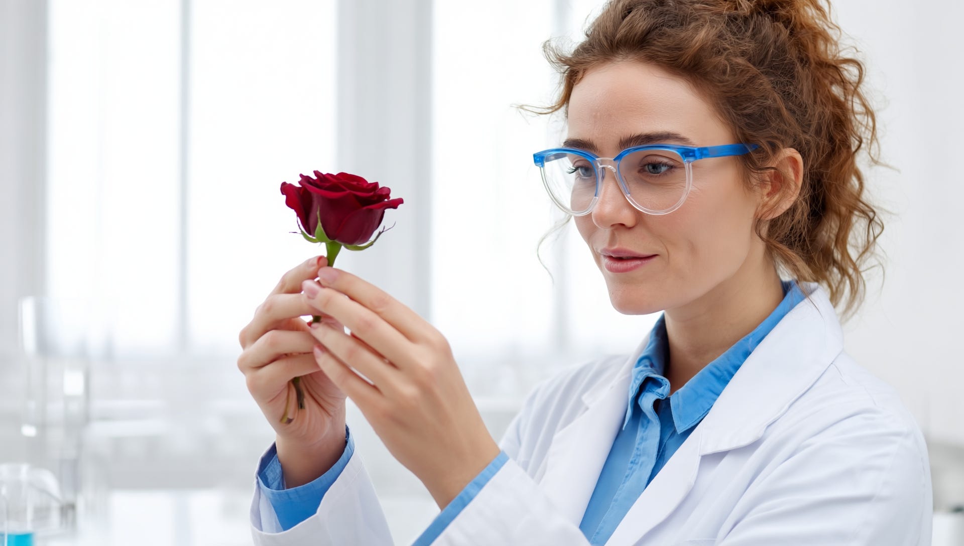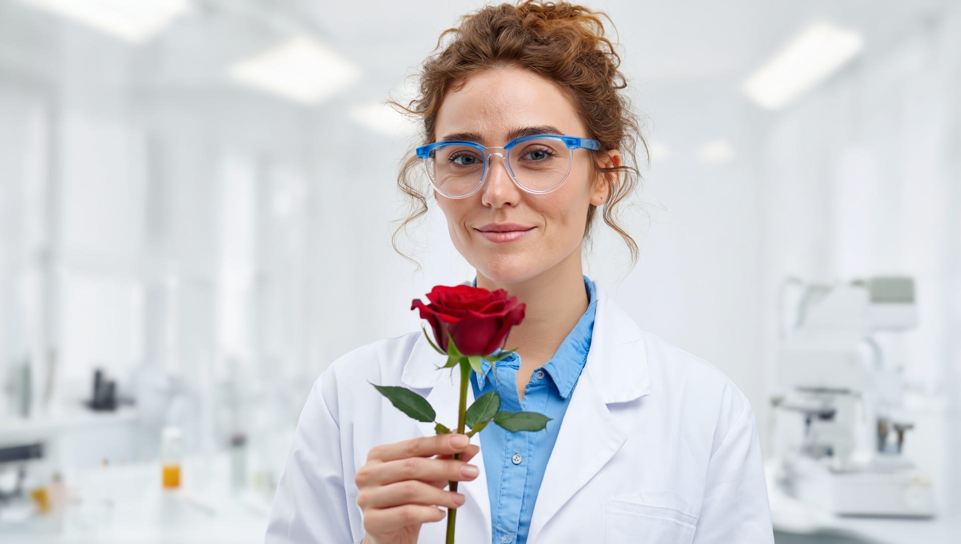 a woman scientist wearing a white lab coat and blue frame glasses is holding a rose