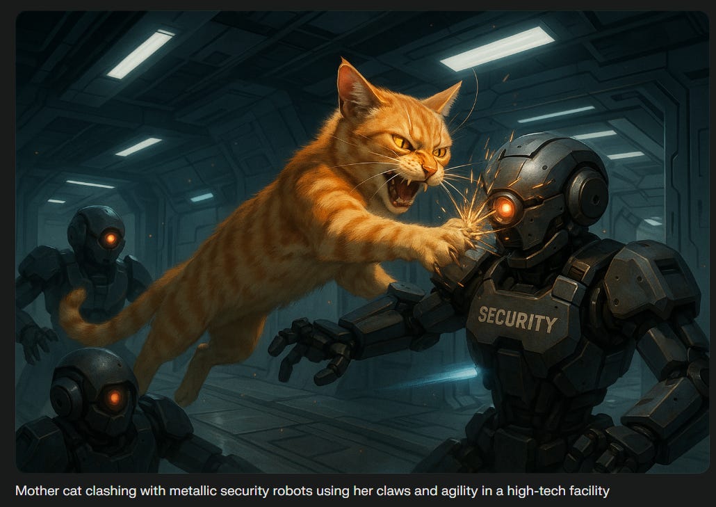 Write a short story about a mother cat surviving in a dystopian science fiction world. The cat must find food or her kittens will die from starvation. She is in a race against time. Create 9 storyboard and a full screenplay.