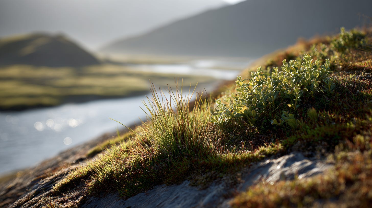 landscape photograph of a small hill near a river, continuous light --ar 16:9 --profile r3snb8i --v 7