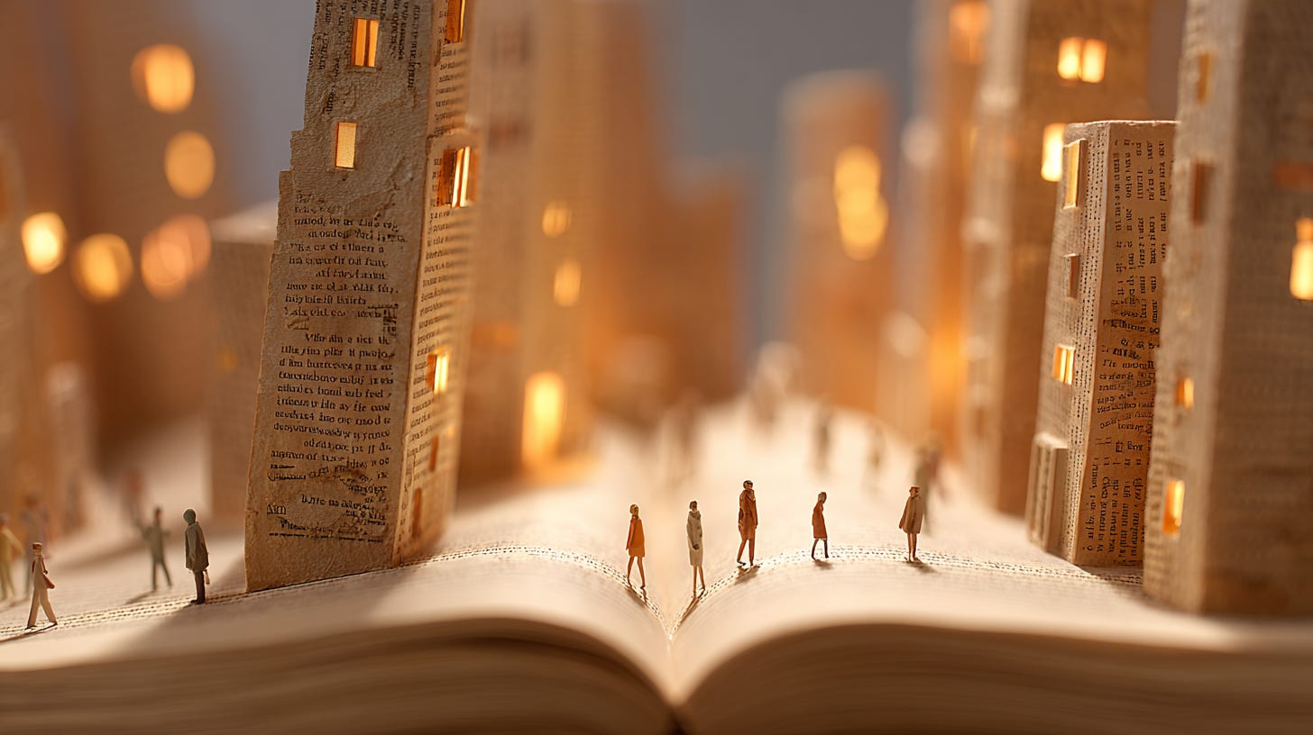 a giant open book transformed into a cityscape, pages standing like skyscrapers, tiny people walking its spine, warm sepia tones, soft ambient lighting --ar 16:9 --profile uw4q9o7 --v 7