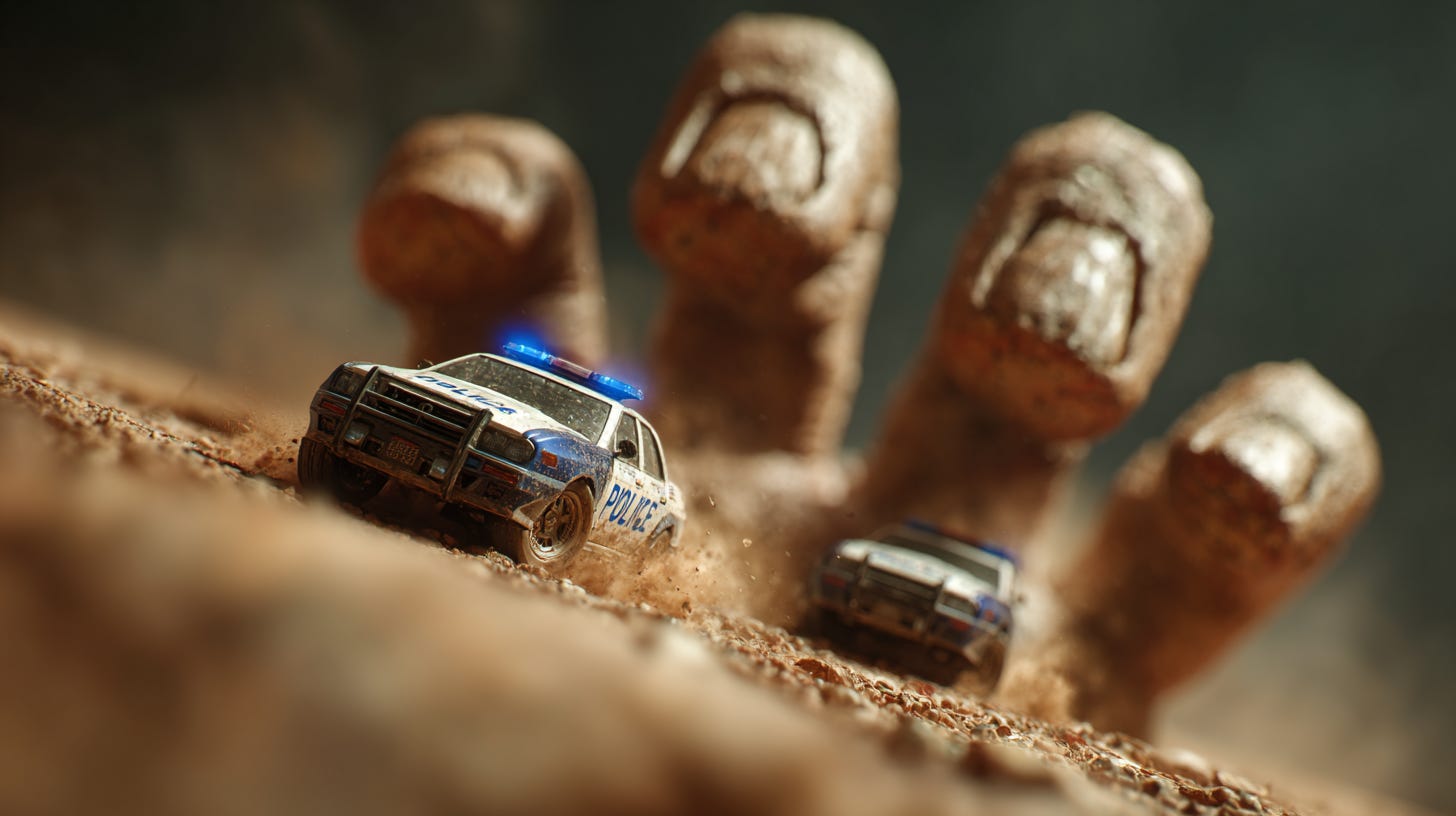 toy-sized police cars in high-speed chase over a giant open hand, dramatic lighting, high-speed motion blur, gritty realism with a surreal twist --ar 16:9 --profile uw4q9o7 --v 7