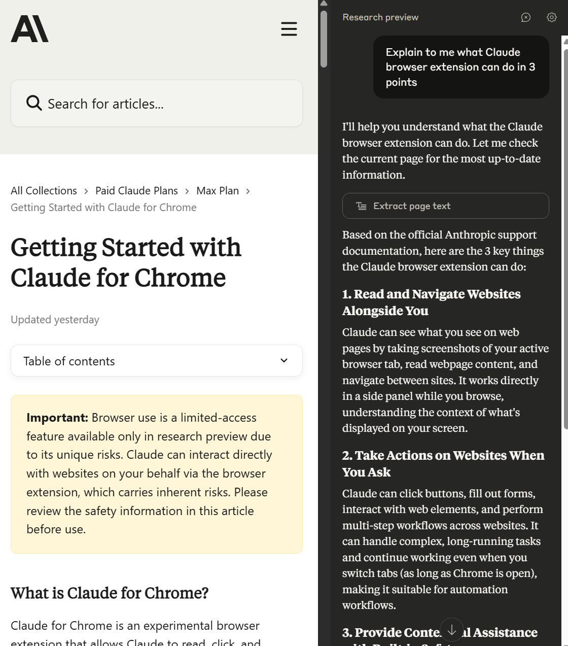 Claude's browser extension for Chrome entered research preview for 10,000 Max users. This experimental feature lets Claude see what you see and take actions directly in your browser.