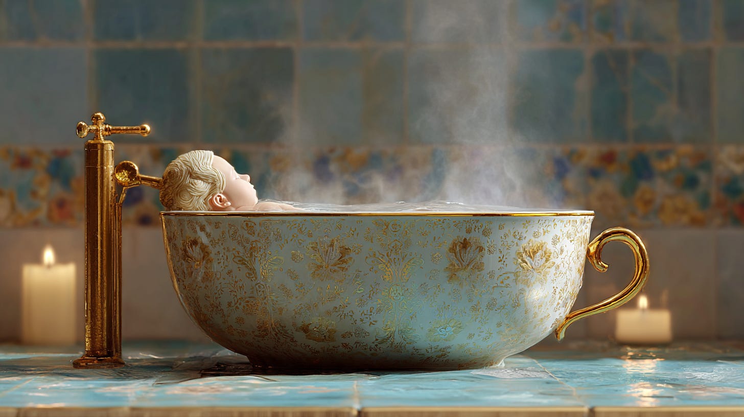 a porcelain teacup used as a luxurious bathtub, human lounging inside with steam rising, golden faucet, ornate tiles, ambient candlelight, pastel and gold hues --ar 16:9 --profile uw4q9o7 --v 7