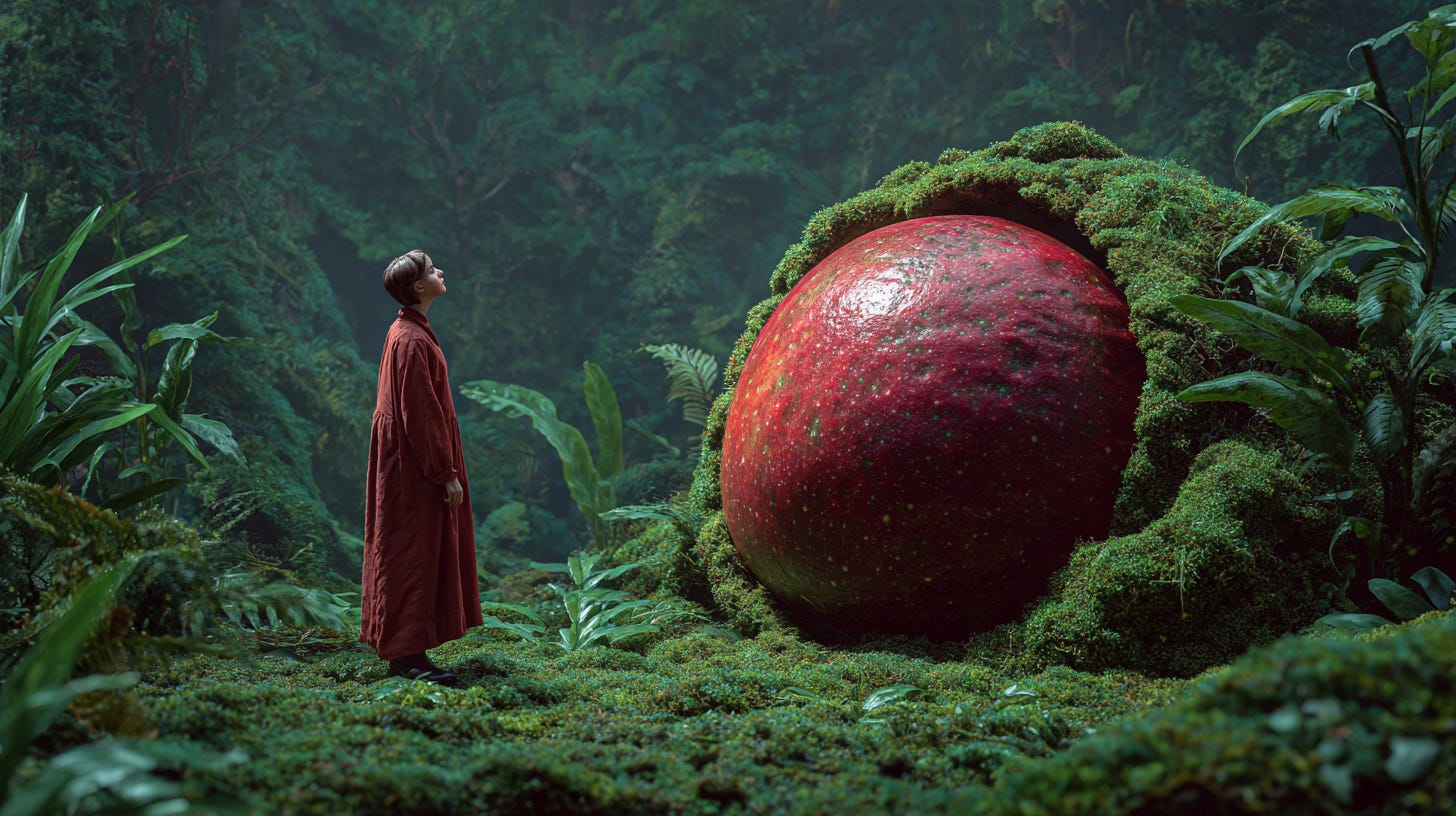 Cover prompt: a surreal forest glade with a massive apple half-buried in moss, woman gazing up at it, early morning mist, rich greens and deep reds, fantasy lighting --ar 16:9 --profile uw4q9o7 --v 7