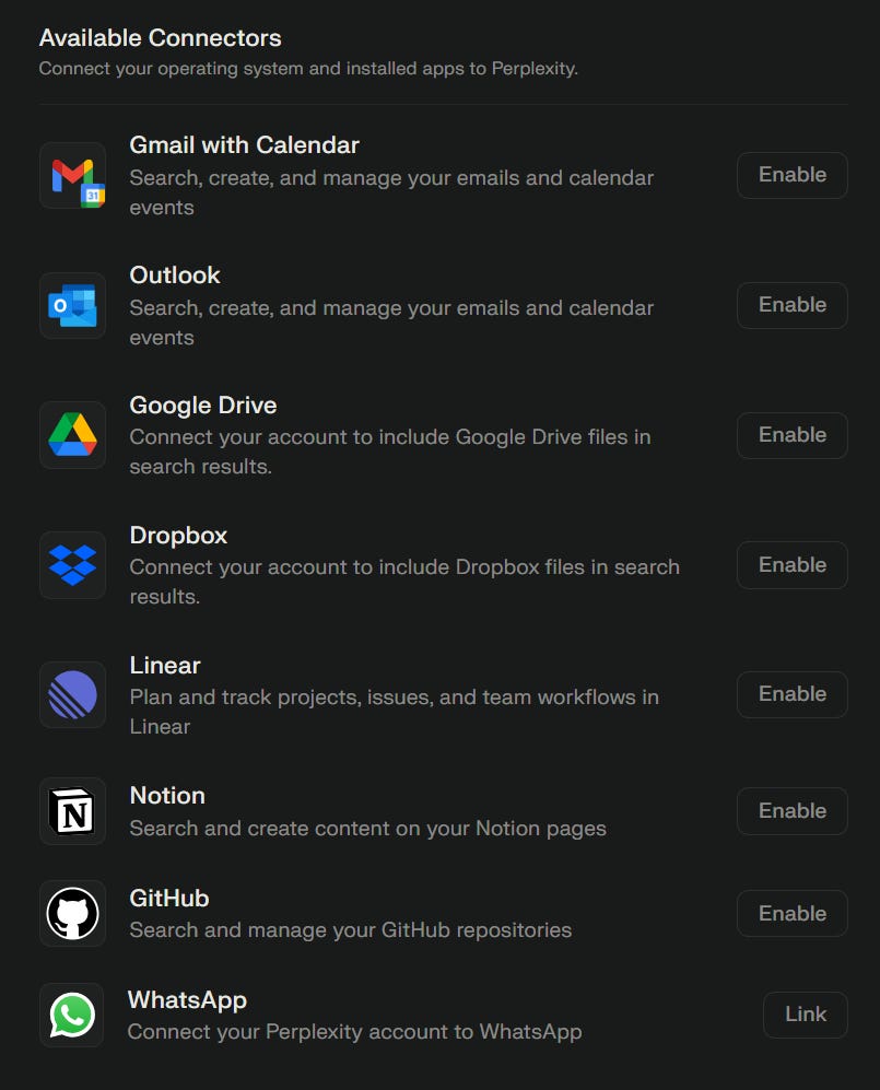 Perplexity now connects to your apps for searching across private sources. Not exactly cutting-edge, as other LLMs have had this feature for a while, but it's useful when you want searches to consider your own resources.