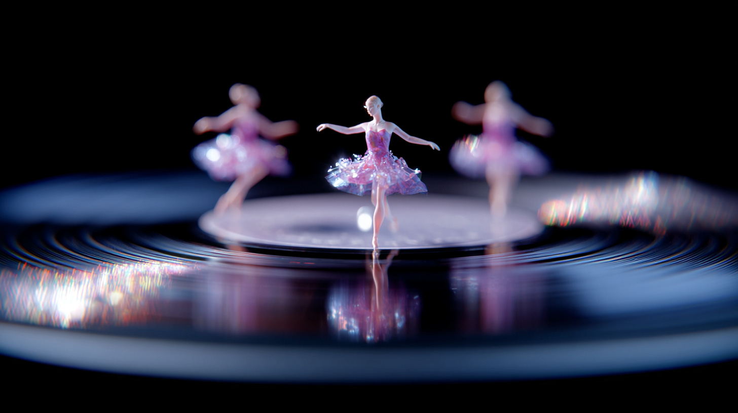 tiny ballerinas dancing on a spinning vinyl record, motion blur and spotlighting, deep blacks with delicate pastels, surreal elegance --ar 16:9 --profile uw4q9o7 --v 7