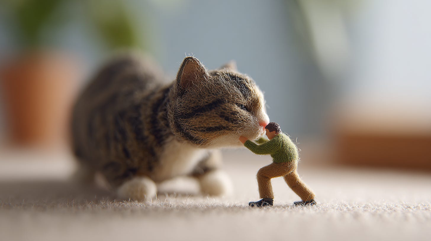 a miniature man grappling with a full-size domestic cat, intense action pose, high detail fur texture, soft living room background, muted tones with sharp contrast --ar 16:9 --profile uw4q9o7 --v 7